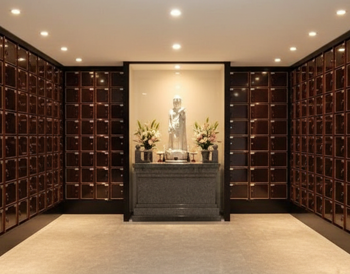 天候に左右されない静かな屋内型納骨堂です。高級感ある木目調の扉と柔らかな照明が、心に寄り添う空間を演出します。